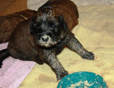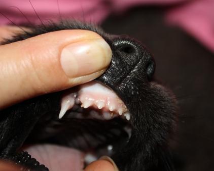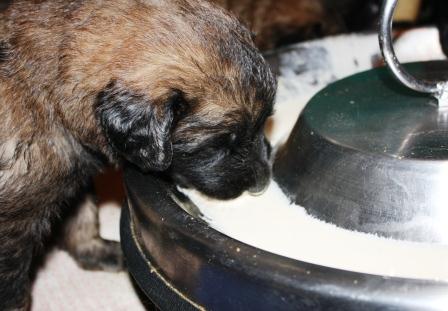 09.03.2012, drei Wochen alt. Die ersten Versuche, Brei zu schlabbern. Die Augen und Ohren sind nun offen. Der Gang ist aufrecht, aber noch wackelig.