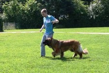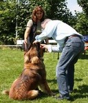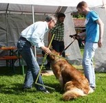 Nach dem gemeinsamen Spielen der Junghunde beginnt der Zuchtrichter mit der Beurteilung der jungen Leonberger. Zuerst wird die Idendität des Hundes überprüft.